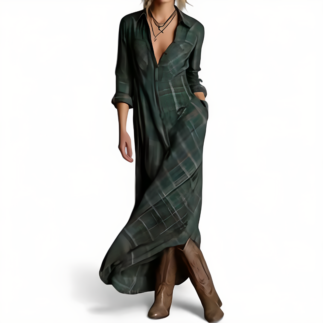 El vestido Clara combina un estilo casual chic con una elegancia clásica. Con su botonera, su cuello de camisa y sus mangas largas, es ideal para la transición entre el día y la noche. Su longitud maxi fluida aporta una sofisticación natural, mientras que su estampado a cuadros añade un toque de encanto moderno.